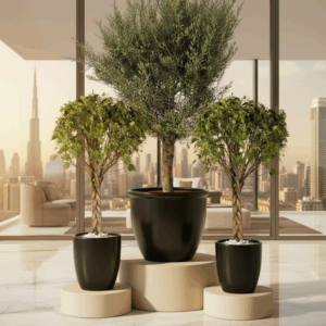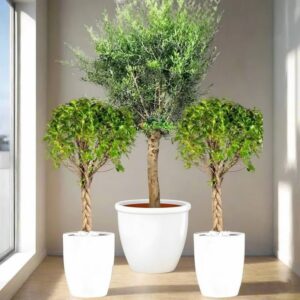 XL Olive Tree with Twin Braided Bonsais Bundle (Big Olive in Rolled Rim Pot 58x43(Ficus Diversifolia Twisted Trunk in ceramic pot)