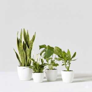 Easy-Care Indoor Plant Quad (Snake Plant 40-60cm, Peace Lily 30-40cm, Monstera Deliciosa 50-60cm, and Dracaena Fragrans-Gold Coast 30-40cm)