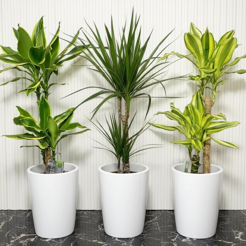 The “3 Dracena Plants Set – 80-100cm in Ceramic Pot” is a curated trio of indoor tropical plants, each standing between 80–100 cm tall, beautifully arranged in ceramic pots—ideal for enhancing home or office interiors.
