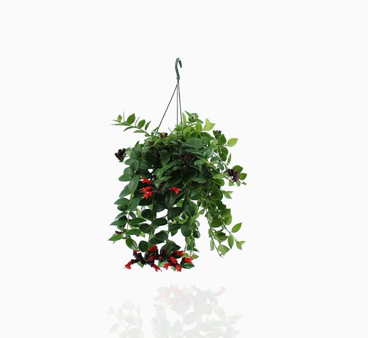 Aeschynanthus Mona Lisa, Nothing brightens up a room like a beautiful flowering plant. The Aeschynanthus lipstick vine has pointy, waxy leaves and blooms with bright clusters of flowers. Growing lipstick plants is not difficult, and with proper care you get rewarded with continuous flowers. Vivid red blossoms emerge from a dark maroon bud reminiscent of a tube of lipstick. Deliverable