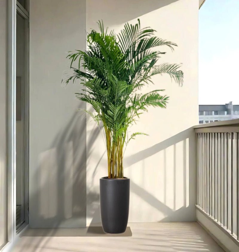 Size: Stands tall at 2 to 2.5 meters (XL size) Look: Feathery, arching green fronds Pot: Sleek black shiny ceramic pot – modern and stylish Type: Tropical palm (Chrysalidocarpus lutescens), also known as Butterfly Palm