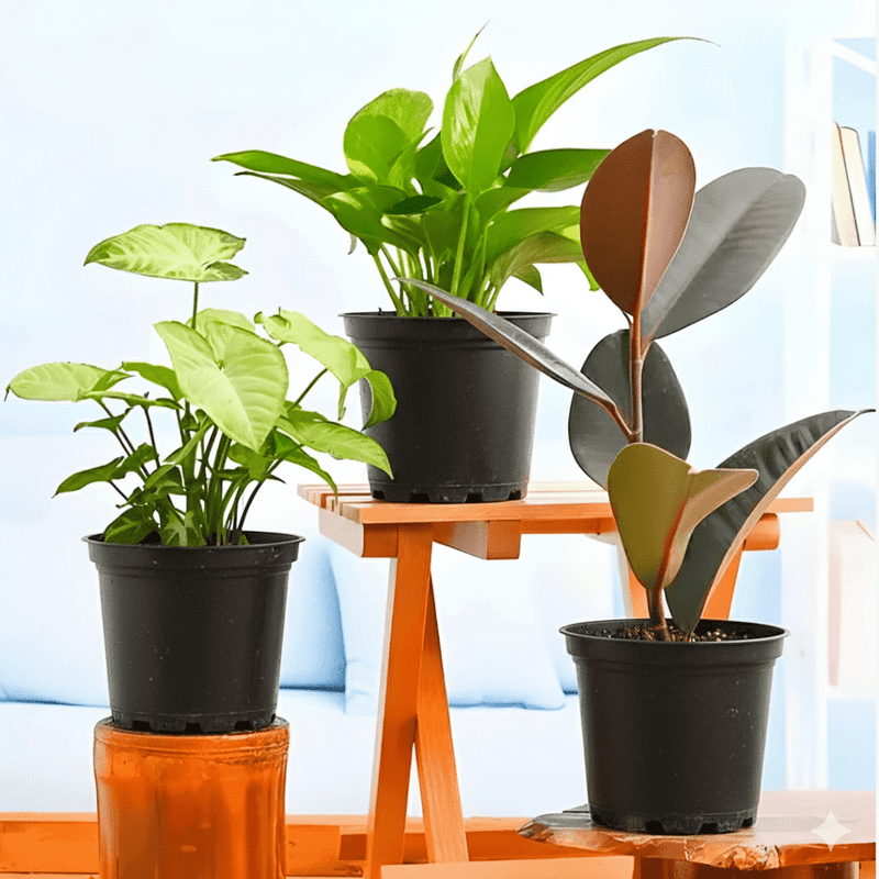 This Decorative Indoor Plant Bundle includes three low-maintenance plants—Rubber Plant, Syngonium Podophyllum, and Money Plant—ideal for adding greenery and style to your indoor space.