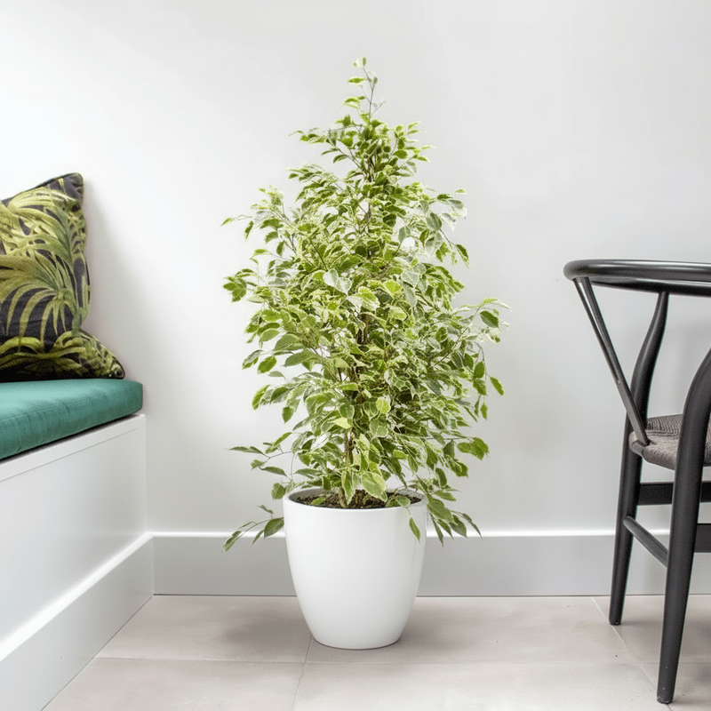 Ficus Benjamina twilight is an excellent house plant, very easy to care. Cream variegated foliage of this weeping fig is attractive and lights up indoors. Requires partial shade to full shade, direct contact with sun can burn leaves. Ficus ‘Twilight’ has benefit of air purification and the plant absorbs many different impurities from the air. Deliverable
