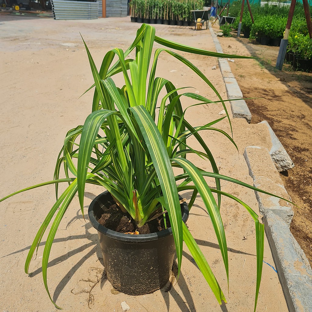 Pandanus veitchii, commonly known as the Veitch’s Screw Pine, is a visually striking plant renowned for its ornamental foliage. Its long, arching leaves are variegated with white stripes, creating a dramatic and attractive display.