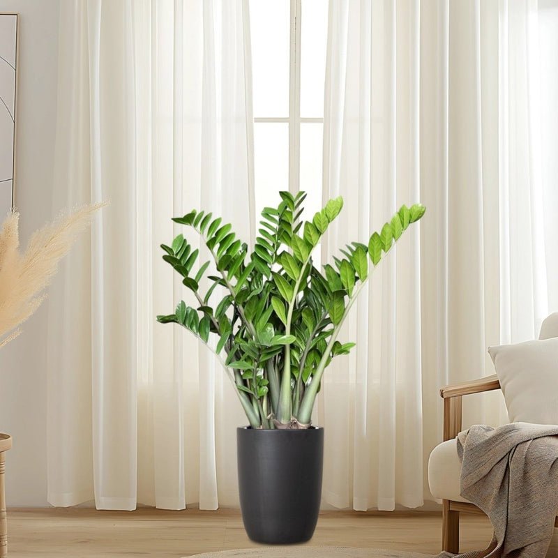 The ZZ Plant indoor (Zamioculcas zamiifolia), also known as the Zanzibar Gem, is a hardy, low-maintenance indoor plant ideal for homes and offices. In a black ceramic pot standing 80–100 cm tall, it makes a bold, elegant statement while thriving in minimal care conditions.